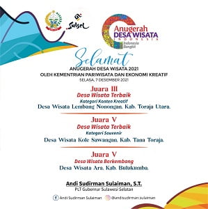 “Alhamdulillah, kita bersyukur dan bangga karena tiga desa di Sulawesi Selatan mendapatkan gelar Anugerah Desa Wisata terbaik. Untuk itu kami mengucapkan terima kasih atas kerjasama semua pihak,” kata Plt Gubernur Sulsel, Andi Sudirman Sulaiman.