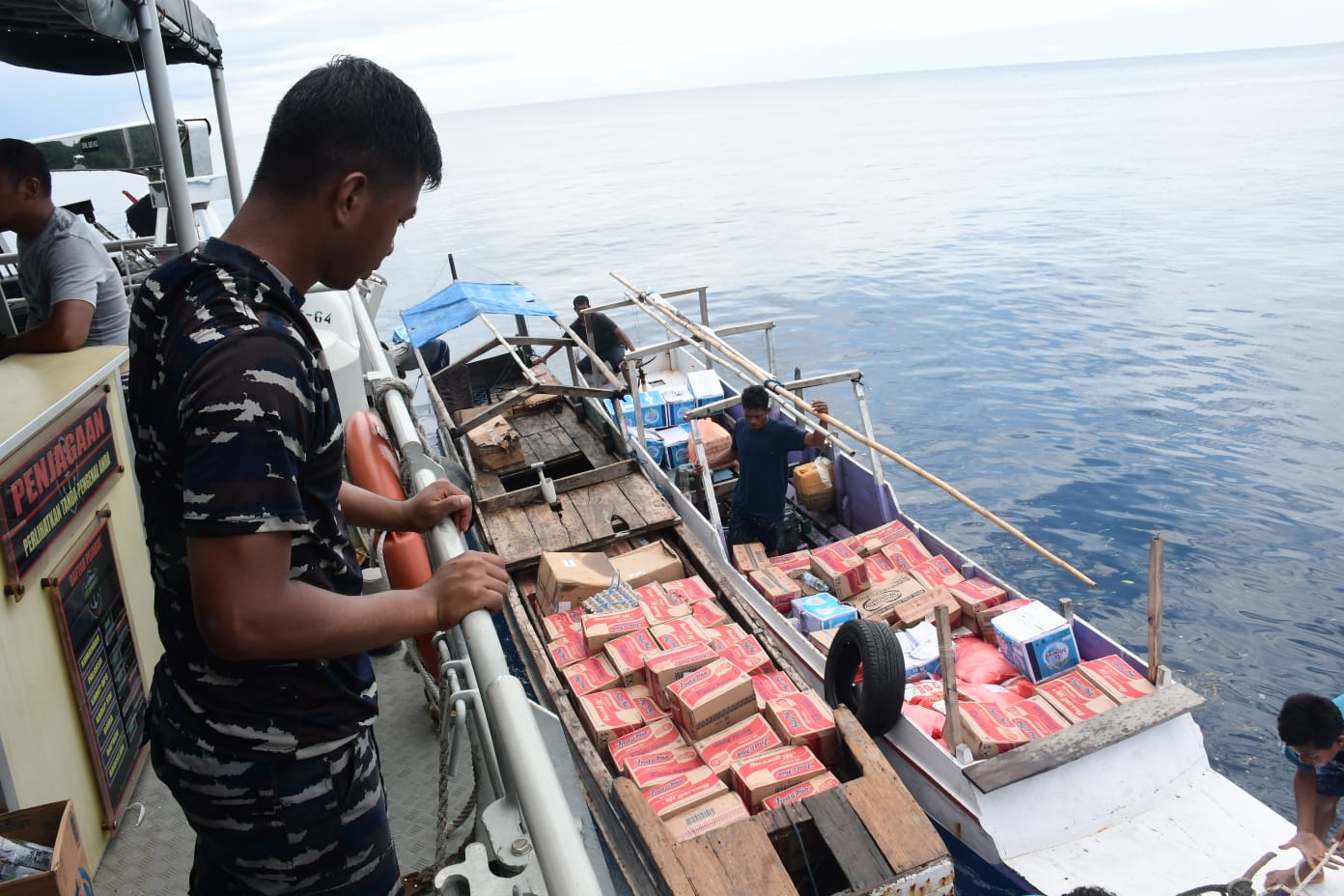 Ratusan paket bantuan dari Kemensos dan BPBD yang berisi berbagai macam kebutuhan pengungsi tersebut langsung dipindahkan ke kapal – kapal nelayan yang datang mendekati Kal Mamuju untuk di droping ke pulau Kalaotoa.