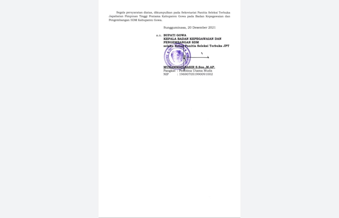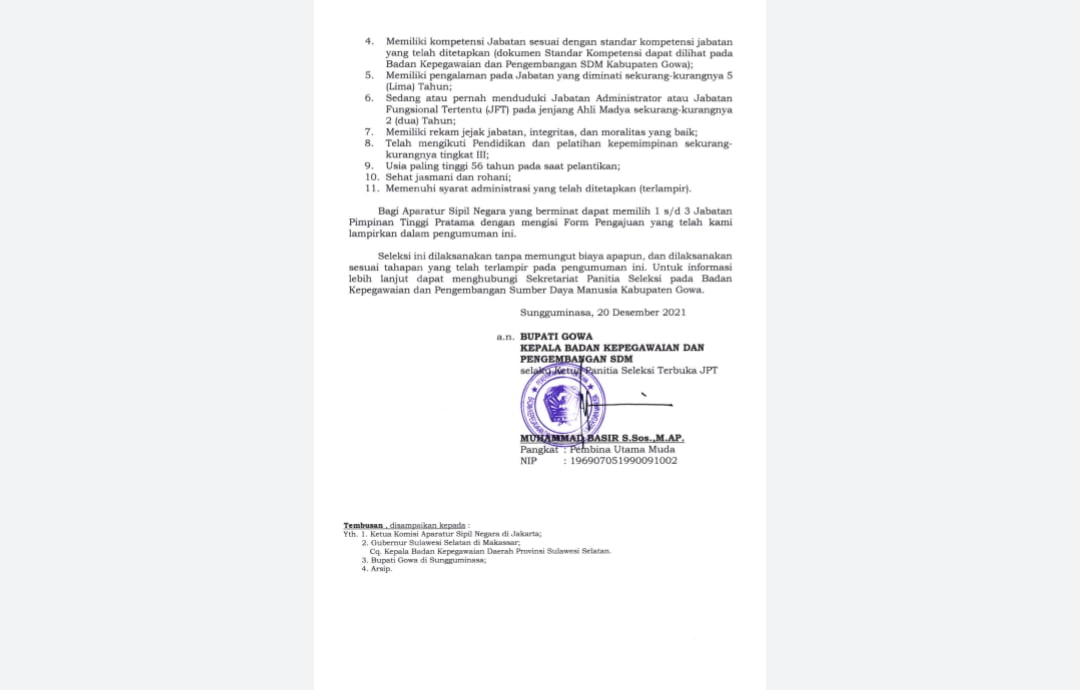Sementara Kepala Badan Kepegawaian dan Sumber Daya Manusia (BKPSDM) Kabupaten Gowa, Muhammad Basir mengatakan, proses lelang jabatan tinggi ini berdasarkan amanat UU Nomor 5 Tahun 2014 tentang Aparatur Sipil Negara dan ditindak lanjuti dengan Peraturan Pemerintah Nomor 11 Tahun 2017 tentang Manajemen Pegawai Negeri Sipil serta surat edaran Menpan RB Nomor 52 Tahun 2020 tentang pelaksanan pengisian Jabatan Pimpinan Tinggi Pratama secara terbuka.