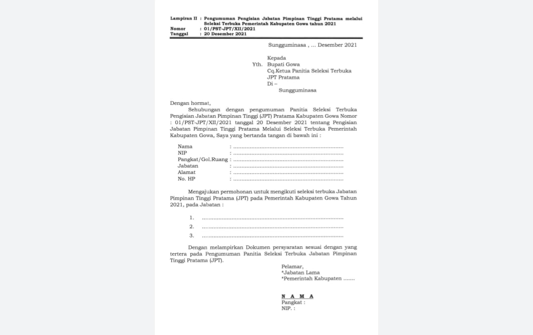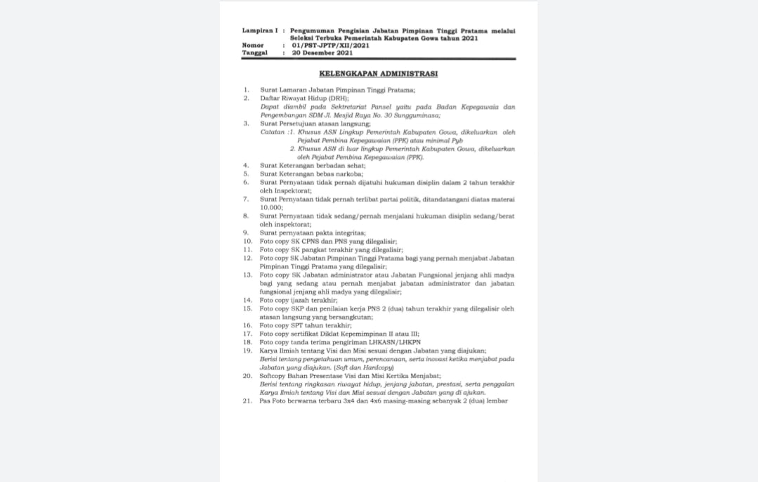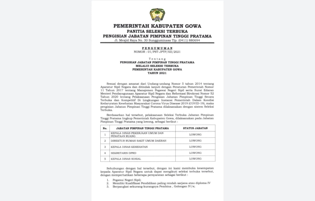 GOWA, NEWSURBAN.ID — Pemerintah Kabupaten (Pemkab) Gowa mulai membuka seleksi terbuka untuk posisi jabatan pimpinan tinggi pratama di 5 (lima) Satuan Kerja Perangkat Daerah (SKPD) yang kosong. Antara lain, Kepala Dinas Pekerjaan Umum dan Penataan Ruang (PUPR), Direktur RSUD Syekh Yusuf, Kepala Dinas Kesehatan, Sekretaris DPRD, dan Kepala Dinas Sosial.