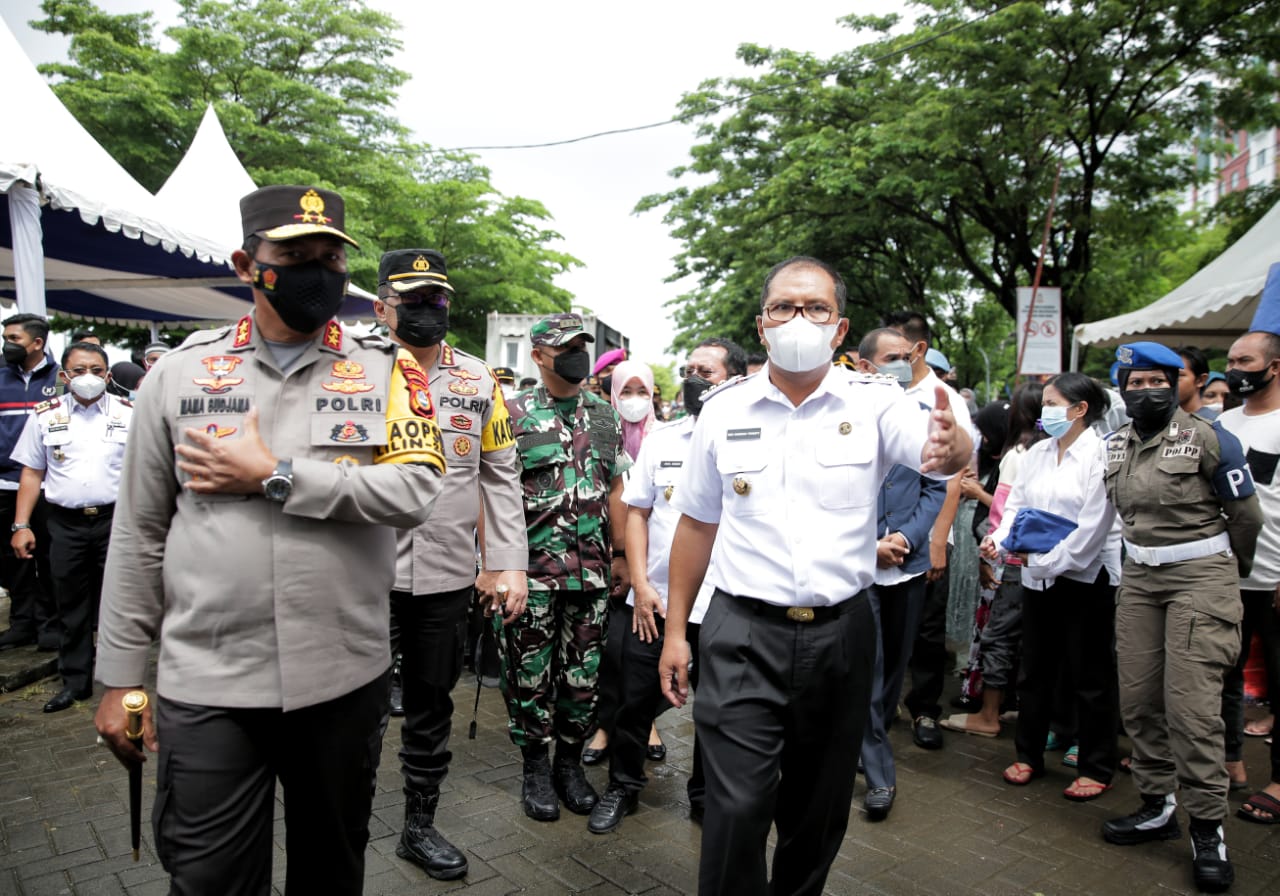 Untuk memberikan semangat agar masyarakat tidak ragu untuk vaksin. Wali Kota Makassar Moh Ramdhan “Danny” Pomanto bersama Kapolda Sulsel Irjen Pol Nana Sudjana mengunjungi Anjungan Pantai Losari, Rabu (29/12/2021).