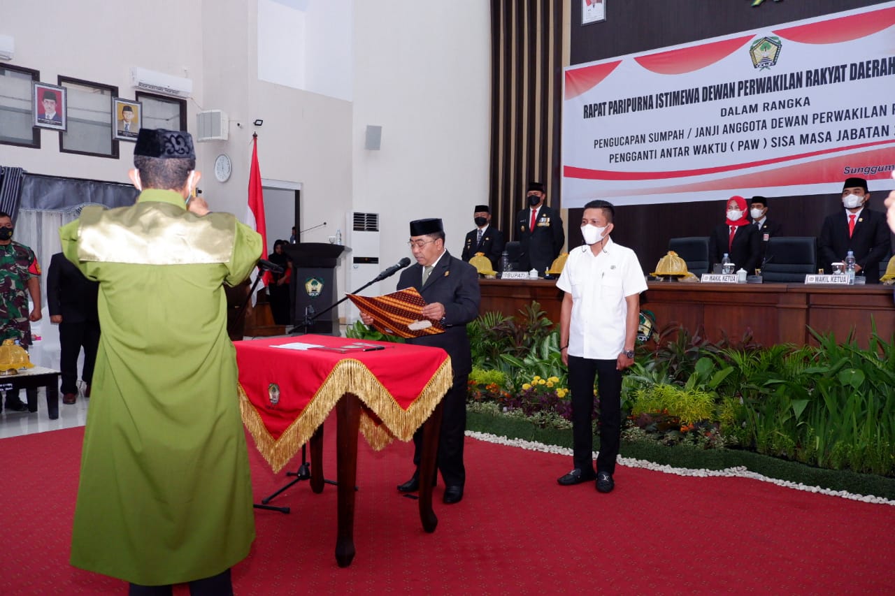 “Hari ini kita mengambil sumpah Anggota DPRD PAW kepada saudari Eka Apriani. Karena sesuai ketentuan pasal yang mengatur, di mana isinya sebelum memangku jabatannya, anggota DPRD kabupaten/kota pengganti antarwaktu sebagaimana pada ayat (3) mengucapkan sumpah/janji. Yang pengucapannya dipandu oleh pimpinan DPRD kabupaten/kota, dengan tata cara dan teks sumpah/janji sebagaimana dalam Pasal 368 dan Pasal 369,” jelasnya.