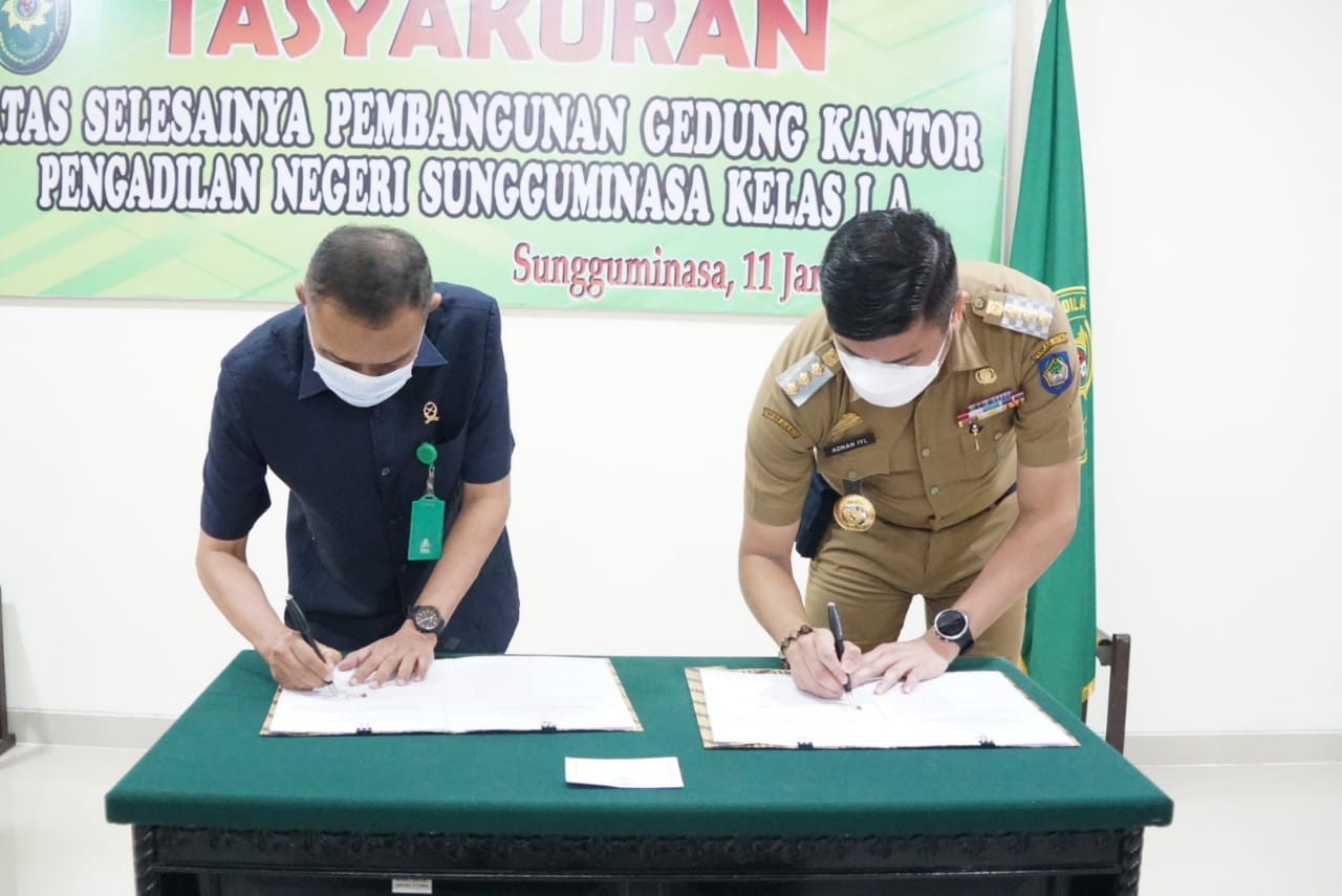 Dalam penandatanganan, pihaknya juga melakukan syukuran selesainya Pembangunan Gedung Kantor Pengadilan Negeri Sungguminasa Kelas I A. Turut hadir Ketua Pengadilan Tinggi Makassar bersama Ketua Dharma Yukti Pengadilan Tinggi Sulselbar.