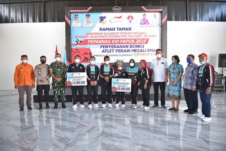 Turut hadir Ketua Pokja Sulteng Emas Ronny Tanusaputra, Ketua TP-PKK Sulteng Ny. Dr. Vera Rompas Mastura, M.Si, Kadis Sosial Provinsi Drs. Ridwan Mumu, M.Si, Ketua Komite Paralimpik Sulteng, Forkopimda dan pejabat terkait. (*)