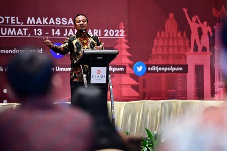Hal itu, ia sampaikan di hadapan para Kesbangpol Provinsi dan Kabupaten/Kota se Indonesia. Pada Rapat Koordinasi Nasional Badan Kesatuan Bangsa dan Politik (Kesbangpol) di Claro Hotel Makassar, 14 Januari 2021.