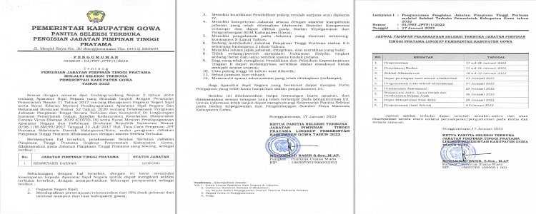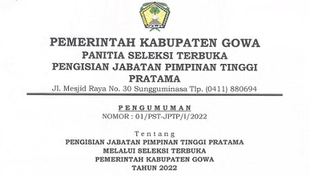 GOWA, NEWSURBAN.ID — Pemerintah Kabupaten (Pemkab) Gowa kembali membuka seleksi terbuka untuk posisi jabatan pimpinan tinggi pratama. Kali ini Pemkab Gowa membuka seleksi untuk posisi Sekretaris Daerah setelah membuka tiga jabatan lowong pada akhir tahun 2021 kemarin.