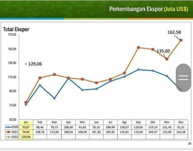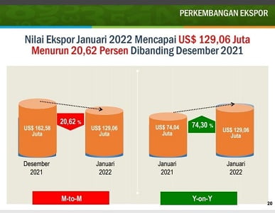 Sementara itu, Kepala BPS Sulsel Suntono secara virtual merilis kepada media Selasa 1 Maret, menyebut nilai ekspor Sulawesi Selatan (YoY) mencapai USD129,06 juta atau meningkat 74,30 persen dari tahun 2021. Di mana pada periode sama mencapai nilai ekspor Sulawesi Selatan USD74,04 juta dan pada Januari 2020 mencapai USD70,67 juta.