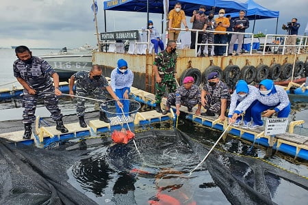 Aspotmar Danlantamal VI Letkol Laut (KH) Bahtiar, mewakili Komandan Lantamal VI Laksma TNI Benny Sukandari. mengatakan pada hari ini, Lantamal VI melaksanakan panen raya 800 ekor ikan jenis kerapu dan kakap di keramba jaring apung Lantamal VI. Serta penebaran bibit ikan sebanyak 10.000 bibit jenis ikan nila dan patin di kolam Panampu Park Makassar.