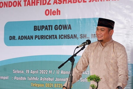 GOWA, NEWSURBAN.ID — Bupati Gowa, Adnan Purichta Ichsan melakukan peletakan batu pertama pembangunan Masjid Nurul A’la Pondok Tahfidz Ashabul Jannah, Desa Timbuseng, Kecamatan Pattallassang, Selasa (19/4).