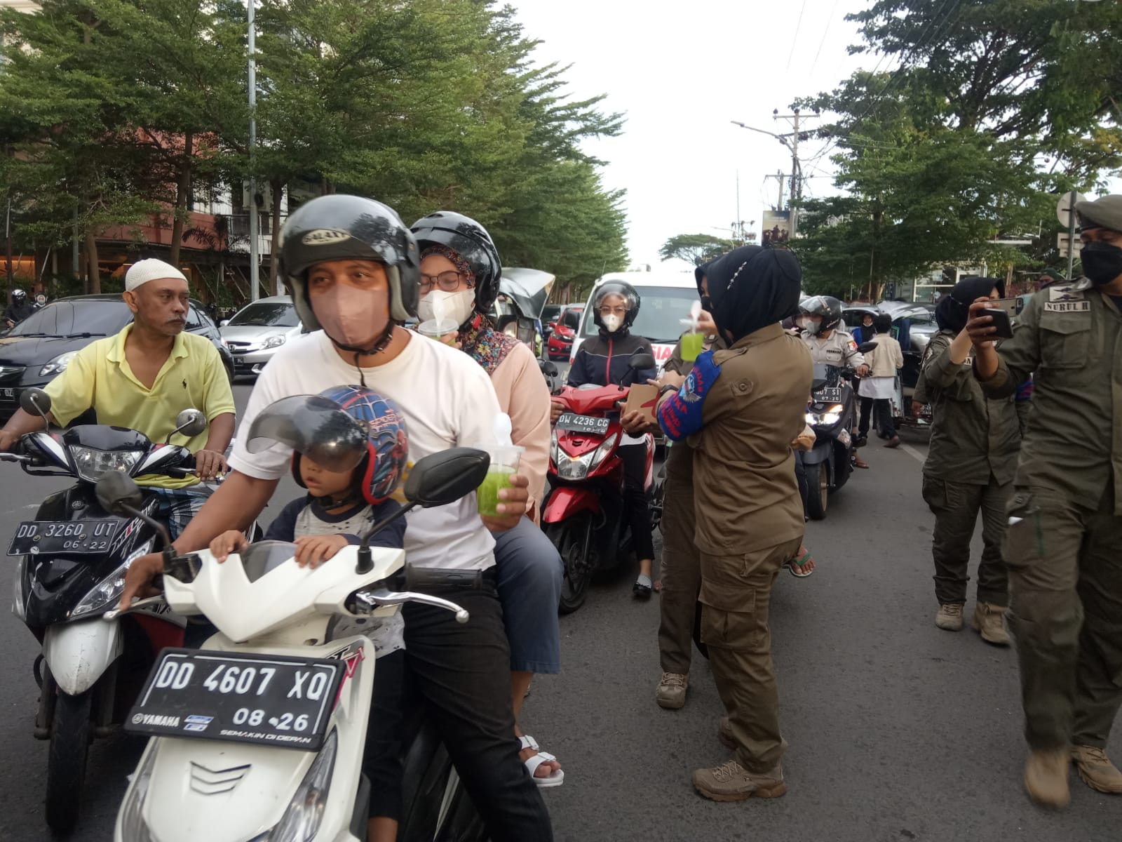 Ada ratusan takjil buka puasa yang di bagikan petugas kepada warga. Sekertaris Satpol PP Makassar, I Nyoman Arya, turut terlibat membagikan menu buka puasa.
