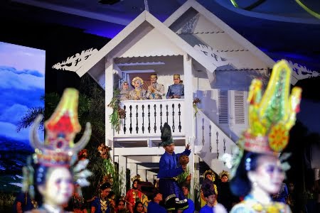 Sekilas ia menjelaskan filosopi rumah yang di topang tiga tiang menandakan yang punya hajatan bukanlah dari keturunan bangsawan. Sementara rumah toraja juga menampilkan tongkonan lumbung yang biasanya di pergunakan rakyat biasa.