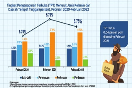 Untuk persentase setengah pengangguran turun 1,14% poin, sementara persentase pekerja paruh waktu turun sebesar 2,82% poin di bandingkan Februari 2021. “Tingkat Pengangguran Terbuka (TPT) Februari 2022 sebesar 5,75 persen, turun sebesar 0,04 persen poin di bandingkan dengan Februari 2021,” sebutnya.