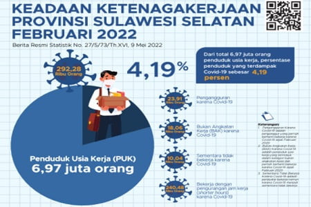 Kepala BPS Sulsel, Suntono mengatakan, bahwa untuk jumlah angkatan kerja pada Februari 2022 sebanyak 4.592.327 orang, naik 158.613 orang dari capaian Februari 2021. Tingkat Partisipasi Angkatan Kerja (TPAK) naik sebesar 0,49%.