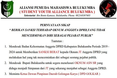 “Berdasarkan hasil analisis, kajian, dan investigasi serta isu yang tengah hangat,diperbincangkan masyarakat di Kabupaten Bulukumba/ terkait beberapa video serta foto yang beredar. Baik di grup whatsapp maupun secara lisan dari masyarakat tentang kelakuan atau perilaku seorang oknum anggota DPRD Bulukumba/ yang sekaligus menjadi Anggota Dewan Pimpinan Partai Golongan Karyat (Golkar) yang tidak mencerminkan diri sebagai seorang Pejabat Publik.”