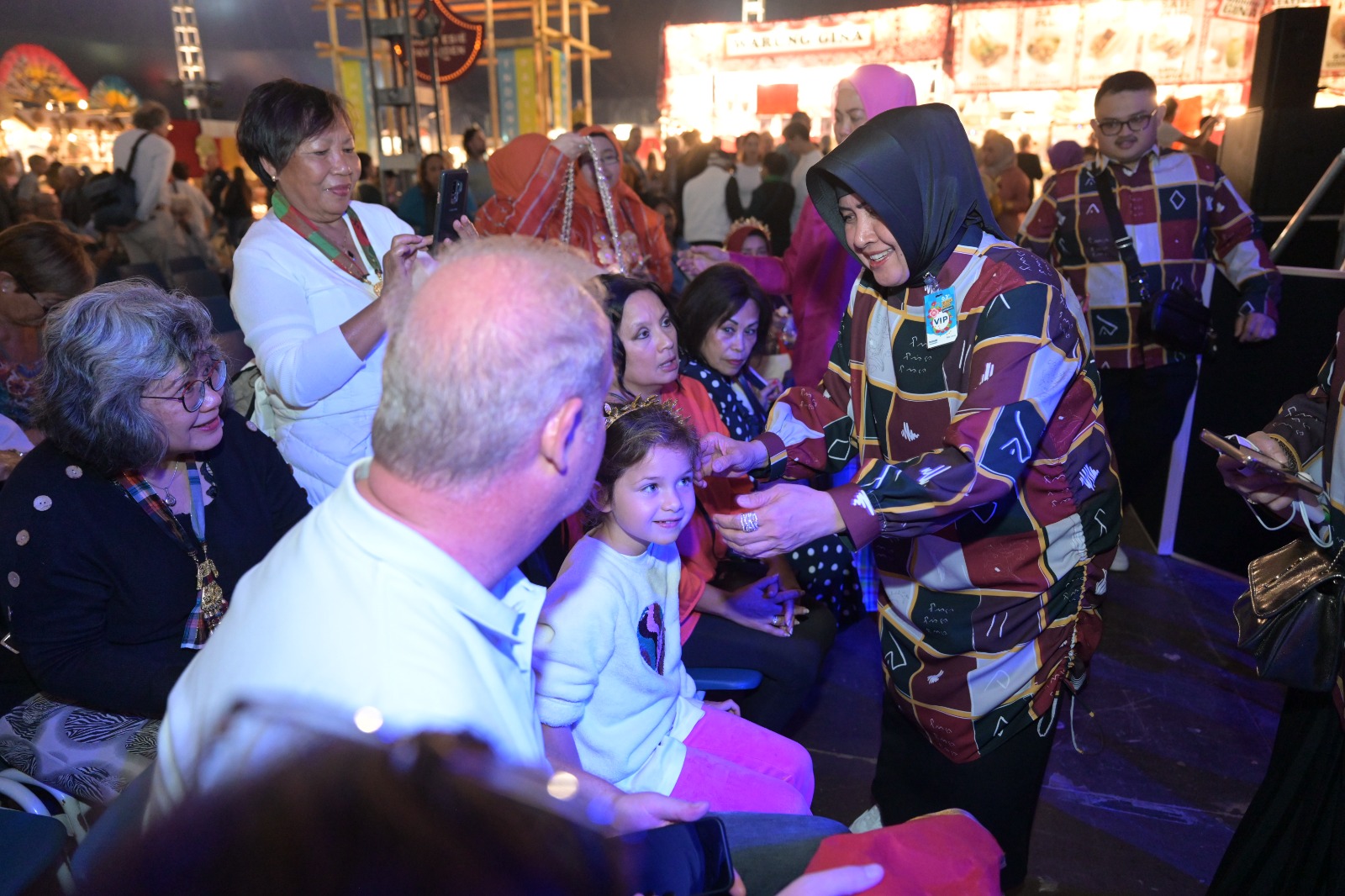 Indira yang hadir menggunakan busana tunik bercorak lontara juga ikut menari. Dia juga memberikan cinderamara sebagai rasa terima kasih kepada pengunjung yang menari bersamanya.