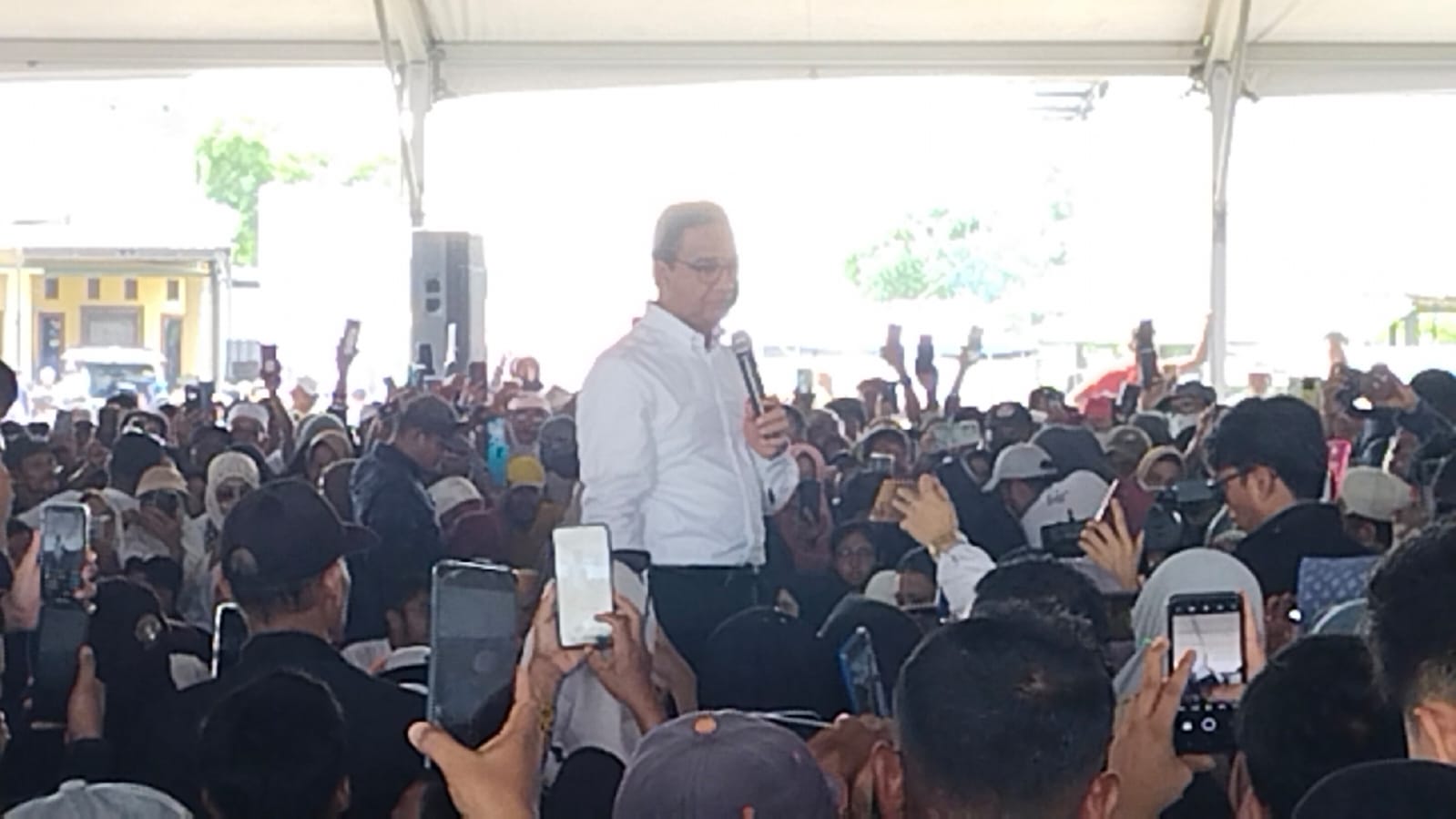 Di hadapan para ribuan masyarakat yang memadati lokasi Kampanye Anies terlihat terpukau dan tersenyum lebar. Sambil menyalami satu persatu warga yang ingin bersalam dengannya. (fan)