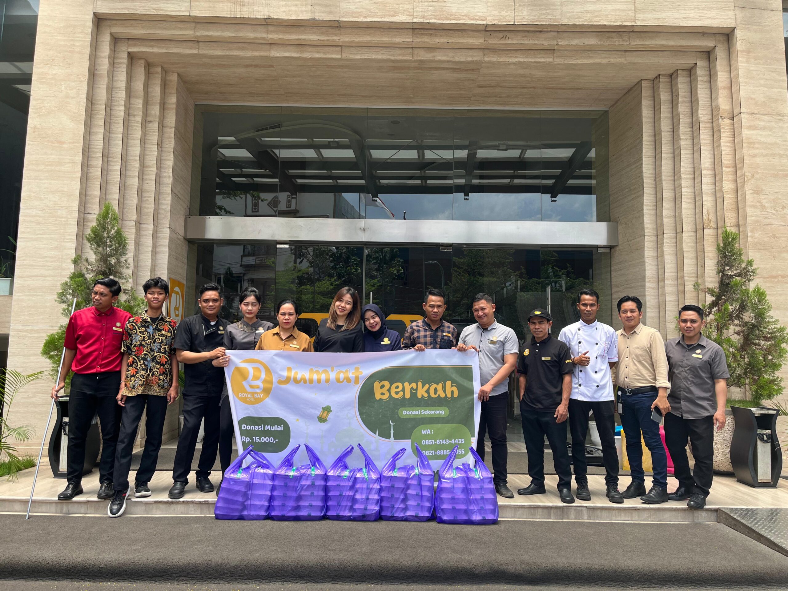 Melalui program “Jumat Berkah”, Hotel Royal Bay Makassar membagikan makanan kepada masyarakat sekitar, termasuk mereka yang membutuhkan, seperti kaum dhuafa, pekerja harian, dan warga yang terdampak. Inisiatif ini juga melibatkan kerjasama dengan pelaku UMKM lokal yang memproduksi makanan dan minuman khas Makassar, seperti coto, jalangkote, dan kue tradisional.