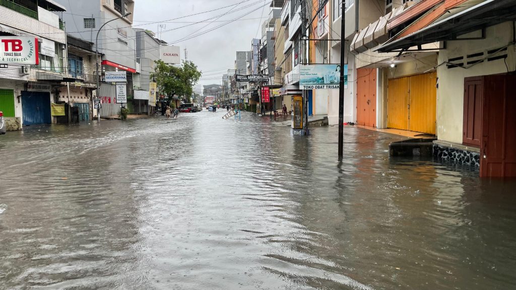 Sejumlah ruas jalan tergenang air, tampak seperti sungai. Di beberapa titik jalan dan permukiman warga, tinggi air sampai selutut orang dewasa.