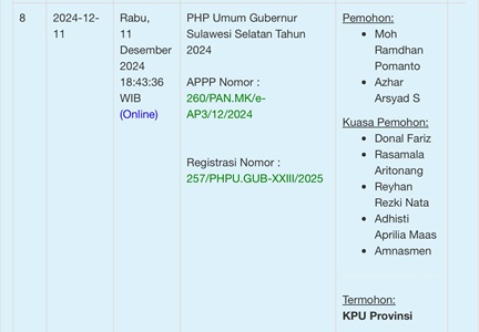 Gugatan tersebut-didaftarkan ke dalam Buku Registrasi Perkara Konstitusi Elektronik (e-BRPK) Pilkada dengan menyebut KPU Sulsel selaku termohon.
