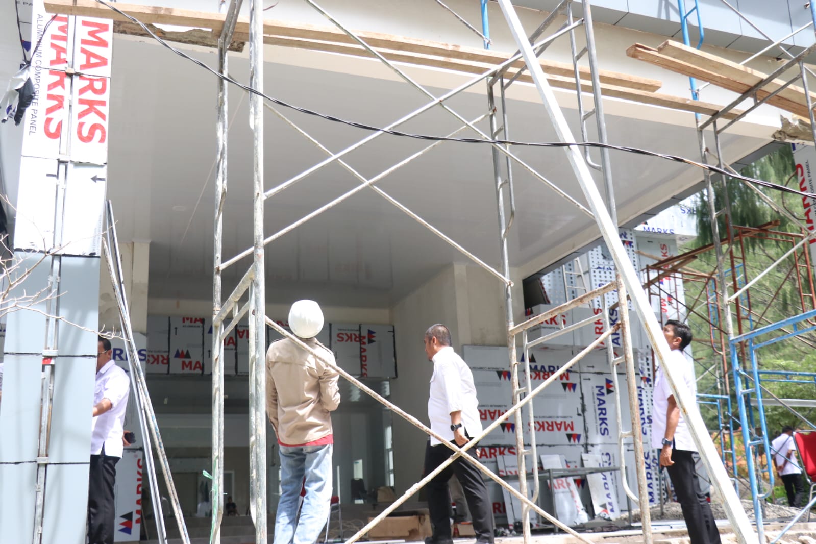 Selesai meninjau lahan, rombongan berlanjut ke Gedung Simpurusiang untuk menginspeksi renovasi yang sedang berjalan. Bupati Irwan menekankan perlunya percepatan pekerjaan.